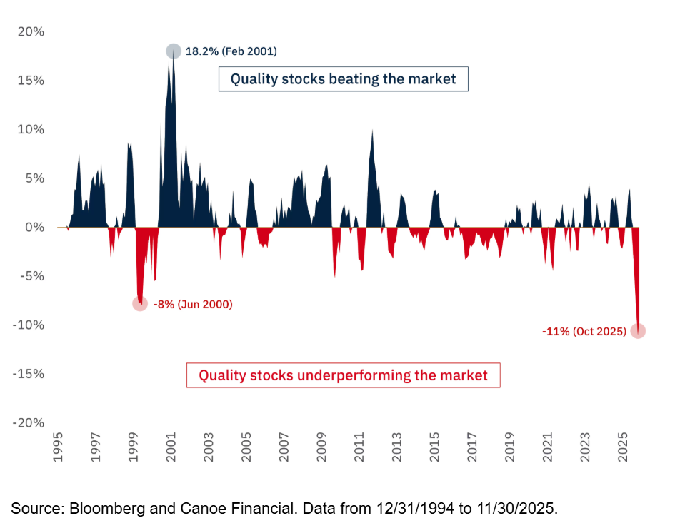 The chart indicates we may currently be experiencing one of those times when quality stocks are relatively less popular as investors simply chase what is going up.